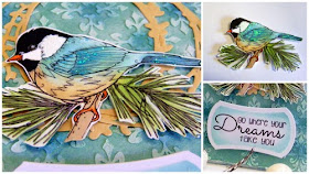 Adhere the wreath Die Cuts to the top portion of the stenciled paper. The Winter Bird image has been stamped onto Flourishes Classic White card stock using black ink and coloured using Memento Inks and sponge daubers.  Highlights added using Memento Markers.  The Chickadee has been fussy cut/hand cut using scissors popped up onto the die cut wreath using 3D Foam Squares.